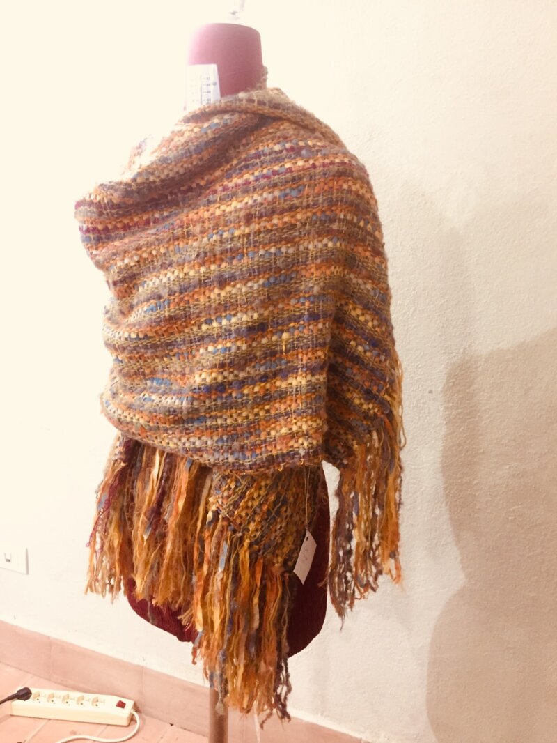 Stola eritrina lana, fettuccia in lana, lino viscosa, elegante pezzo unico fatto a mano per abbigliamento e accessori uomo donna, filato utilizzato 100% lana, fettuccia in lana, lino, viscosa. peso gr 300 circa. dimensioni cm 205X55